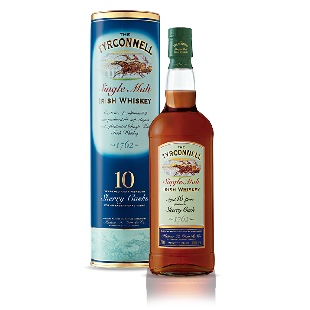 After ten years spent in bourbon barrels, The Tyrconnell Sherry Cask Finish spends an additional 6-8 months in Oloroso Sherry casks from Spain. The casks exert their influence on the whiskey, creating a noticeably darker finished product. The interaction of single malt and fortified wine casks creates a veritable dessert in a glass, in which thick notes of sherry find themselves melding amongst hints of tarte tatin and custard.